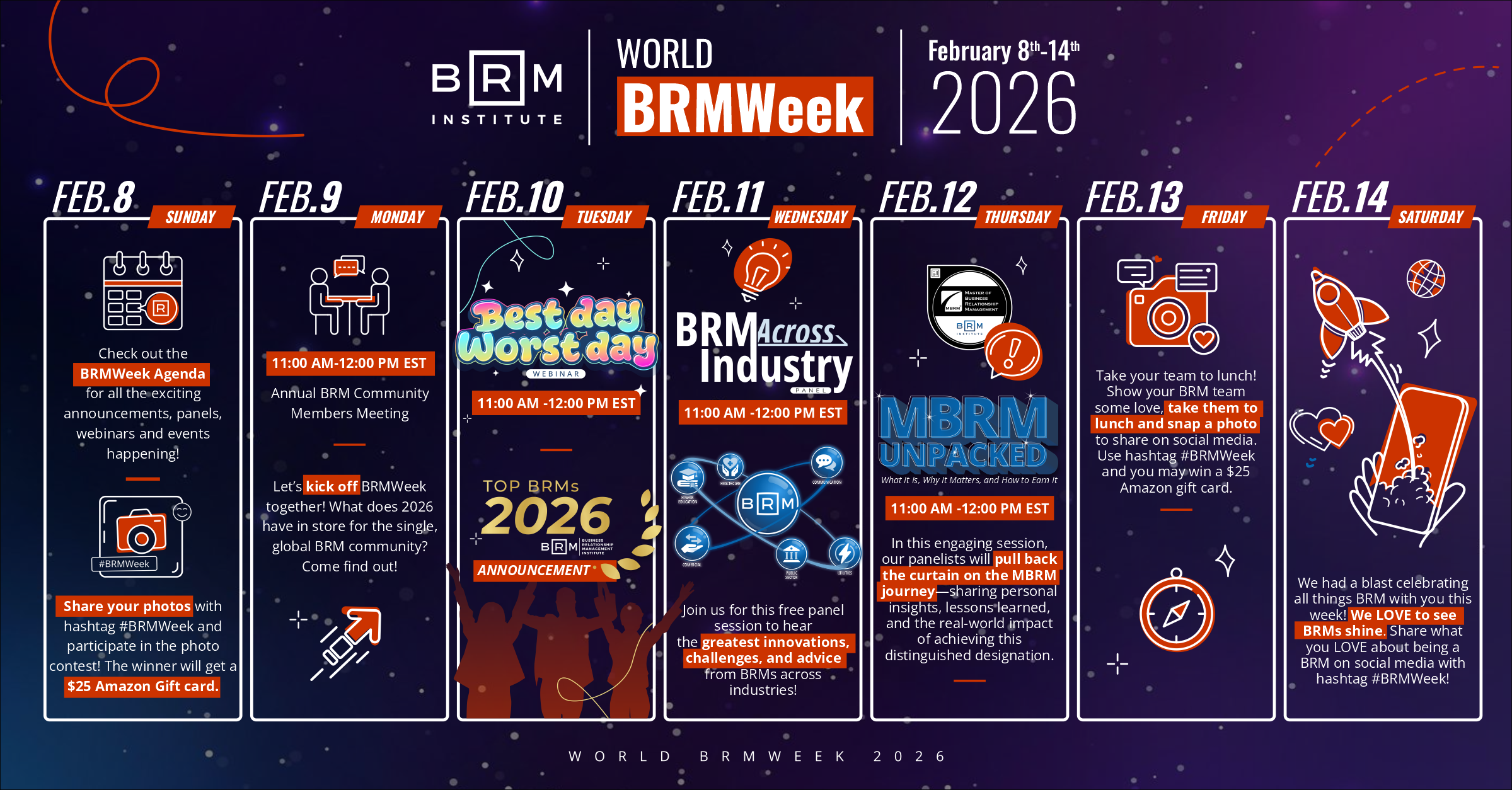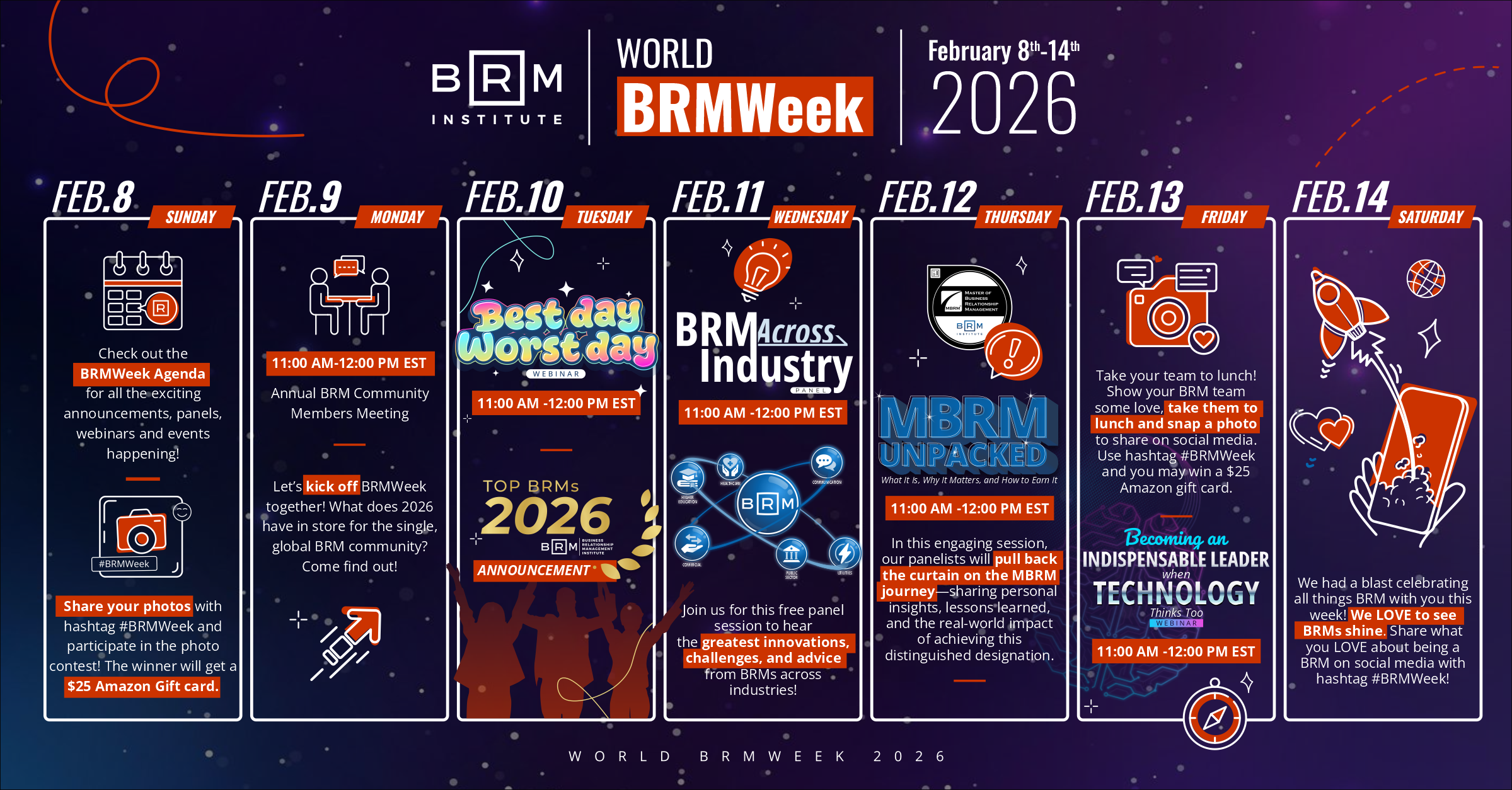 Don’t forget to check out the BRMWeek Agenda for all the exciting webinars, announcements, and events happening throughout the week!